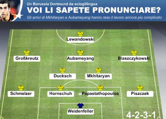 CALCIOMERCATO BORUSSIA DORTMUND – Giovani, bravi e talentuosi: stiamo parlando dei ragazzi del Borussia Dortmund, una delle più belle realtà calcistiche emerse nell’ultimo anno. Dopo il secondo posto in Champions League, la squadra di Kloop si prepara ad affrontare una nuova stagione con dei rinforzi in più. Rinforzi che, non solo aumentano il livello della rosa ma rendono anche più complicata la pronuncia della formazione dell’undici titolare. Come si vede in foto, gli ultimi arrivati sono Mkhytarian e Aubameyang non proprio cognomi semplicissimi. Aggiungiamoci poi i vari Blaszczykowski, Ducksh, Piszczeck, Grosskreutz, Papastathopoulos e l’estremo difensore Weindfeller e possiamo immaginare quanta difficoltà potranno trovare i telecronisti nel commentare una partita del Borussia.