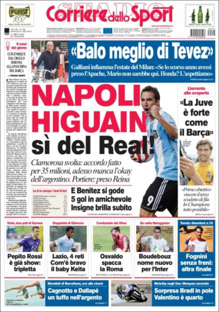 RASSEGNA STAMPA CORRIERE DELLO SPORT – Clamorosa svolta: accordo fatto per 35 milioni di euro, adesso manca l’ok dell’argentino. Portiere: preso Reina. Llorente allo scoperto: “La Juve è forte come il Barca. Primo obiettivo vincere il terzo scudetto di fila. In Champions tutto è possibile”. “Balotelli meglio di Tevez”. Galliani infiamma l’estate del Milan: “Se lo scorso anno avessi preso l’Apache, Mario non sarebbe qui. Honda? L’aspettiamo”. Pepito Rossi è già show: tripletta. Osvaldo spacca la Roma.