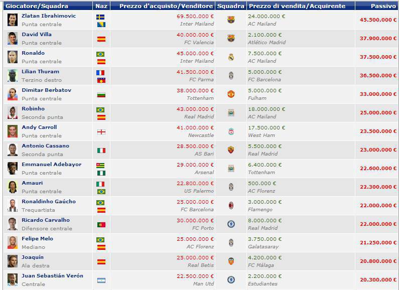 N.B. In questa classifica non si tiene conto degli ammortamenti, cifre che le società vanno a decurtare nel bilancio. Non sc dunque di minusvalenze reali di bilancio, ma soltanto di differenza di prezzi tra acquisti e cessioni.