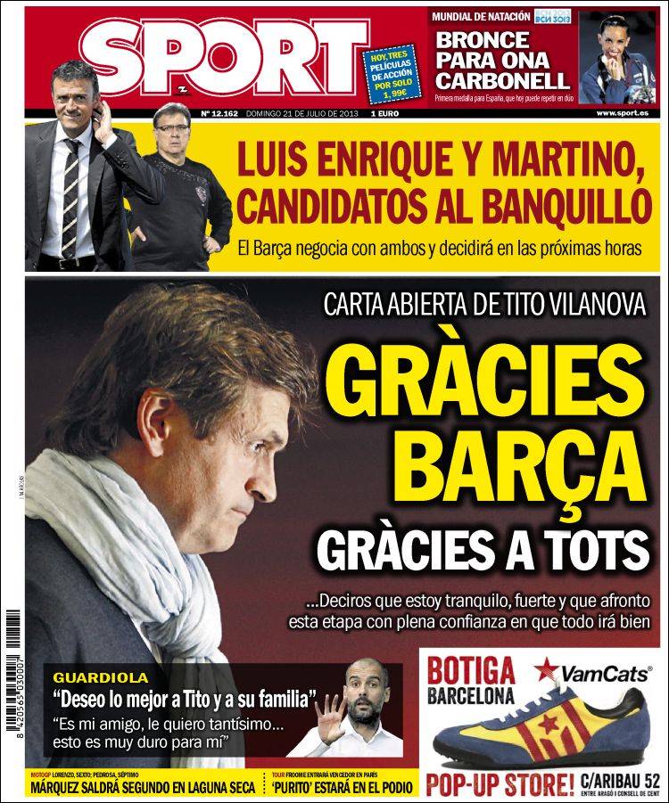 RASSEGNA STAMPA SPORT – TIto Vilanova rinuncia al suo incarico sulla panchina del Barcellona a causa del tumore che lo ha colpito nuovamente. Luis Enrique e Martino sono i due nomi in ballo per la panchina blaugrana.