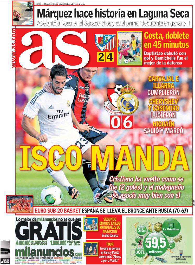 AS ISCO – Anche il quotidiano As elogia la prova di Isco nella prima amichevole del Real Madrid di Ancelotti.