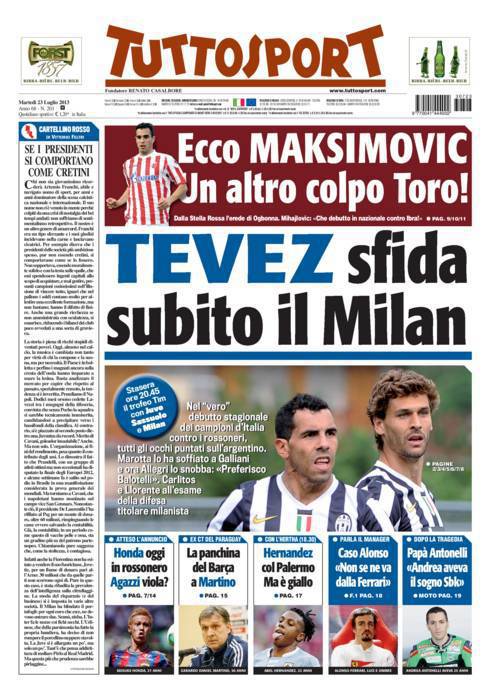 TUTTOSPORT MILAN – Su Tuttosport si parla di Tevez che questa sera giocherà contro il Milan nel trofeo Tim.