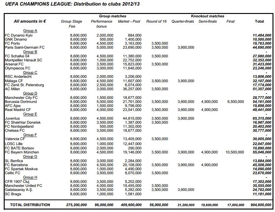 PREMI UEFA 2012/2013 – La Uefa ha distribuito un totale di 904,6 milioni di euro alle squadre che hanno partecipato alla scorsa edizione della Champions League. Lo rende noto la Federcalcio europea, precisando che il Bayern, campione d’Europa grazie al 2-1 sul Borussia Dortmund, ha incassato dalla Uefa un totale di 55,046 milioni di euro. Il Dortmund ha incassato un totale di 54,161 milioni di euro. Le altre squadre che hanno incassato cifre di rilievo per la Champions League 2012/13 sono: Juventus, che ha incassato piu’ di tutti (65,3 milioni), Milan (51,4 milioni), Real Madrid (48,4 milioni), Barcellona (45,5 milioni) e Paris Saint-Germain FC (44,7 milioni). Un vero tesoro per la squadra bianconera grazie ai quali Marotta sta costruendo la squadra che tenterà la scalata all’Europa.