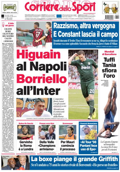 CORRIERE HIGUAIN BORRIELLO – Sul Corriere dello Sport si parla di Higuain al Napoli mentre Borriello è vicino all’Inter.
