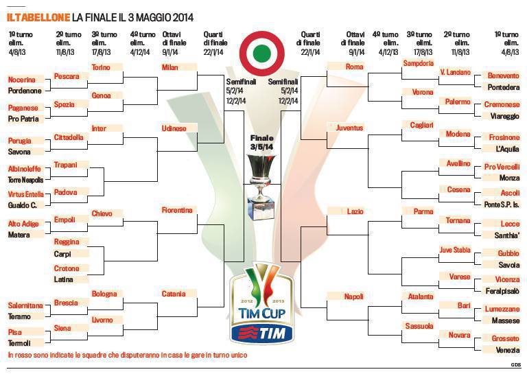 COPPA ITALIA TABELLONE MATCH – Ieri si è svolto il sorteggio per il tabellone di Coppa Italia che inizierà ufficialmente il 4 agosto. Ci saranno i match tra i club delle categorie inferiori, le squadre di Serie A inizieranno il 17 agosto e tra queste ci sarà anche l’Inter che a causa della pessima posizione in classifica della scorsa stagione dovrà iniziare prima delle grandi squadre. I nerazzurri se la vedranno contro una tra Perugia, Savona e Cittadella, se dovessero passare il turno troverebbero l’Udinese. Nei quarti possibile derby contro il Milan. Finale a Roma il tre maggio.