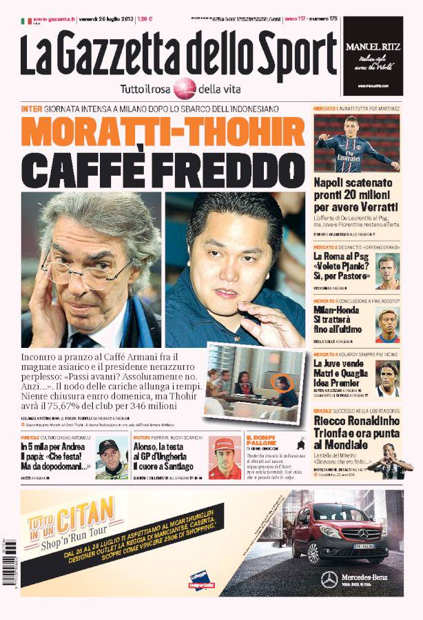 GAZZETTA MORATTI – Ieri pranzo tra Moratti e Thohir per il passaggio dell’Inter all’indonesiano.