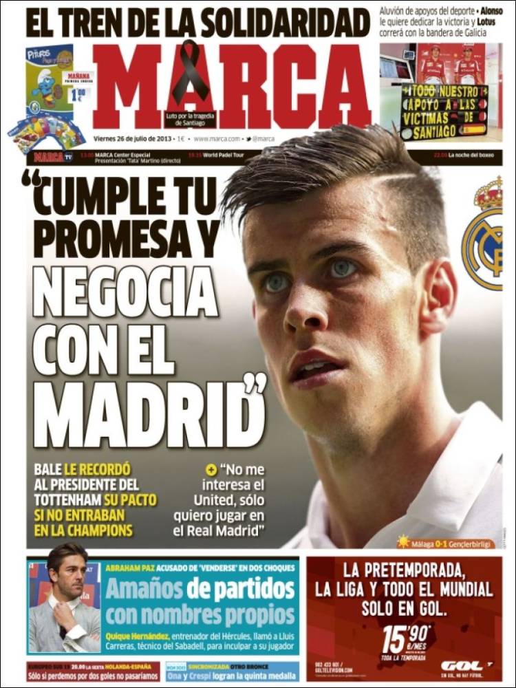 MARCA REAL MADRID – Sul quotidiano Marca si parla di Bale che ha ricordato al presidente del Tottenham la promessa.