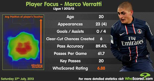 CALCIOMERCATO FOTO VERRATTI JUVENTUS PSG – Marco Verratti è un talento che ancora non ha raggiunto l’apice della sua maturità calcistica. A soli 20 anni, l’ex centrocampista del Pescara ha trovato nel Psg un ambiente ideale dove poter crescere allenandosi con i migliori giocatori del mondo. Nonostante i tentativi di qualche club italiano di riportarlo in Italia, pare proprio che il giovane resterà a Parigi un altro anno. Intanto diamo un’occhiata ai numeri di Verratti. Dopo averlo fatto capiamo perchè la Juventus lo ha puntato come erede di Pirlo. Intanto il piede è raffinato e ben educato con 4 reti e altrettanti assist in 20 presenze: non male per un giocatore dal ruolo simile. La percentuale dei passaggi riusciti è poi altissima rasentando l’89,4 %. Come si legge dai dati in foto raccolti da WhoScored.com, Verratti ha tutte le carte in regola per diventare l’erede di Pirlo anticipando addirittura le tappe del suo predecessore.