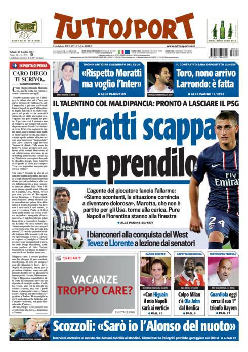 TUTTOSPORT VERRATTI – Su Tuttosport si parla di Verratti che vorrebbe andare via dalla Juventus.