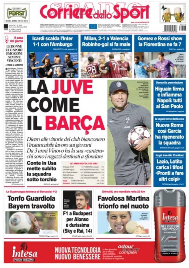 RASSEGNA STAMPA CORRIERE DELLO SPORT – Dietro alle vittorie del club bianconero, l’instancabile lavoro sui giovani. Da tre anni Vinovo ha la sua cantera: chi sono i ragazzi destinati a sfondare. Icardi scalda l’Inter: 1-1 con l’Amburgo. Milan, 2-1 a Valencia. Robinho-gol si fa male. Gomez e Rossi show: la Fiorentina ne fa sette. Higuain firma e infiamma Napoli: tutti al San Paolo. Nuova Roma: Così Garcia ha rigenerato la squadra. Lazio, Lotito carica i tifosi: “Pronti a fare altri colpi”.