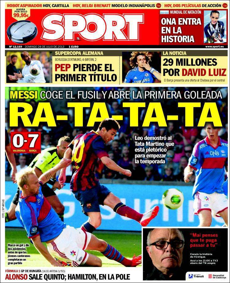 RASSEGNA STAMPA ESTERA SPORT – Prima goleada del Barcellona sotto gli occhi del nuovo tecnico Tata Martino. Lionel Messi è già in grande forma. Pep Guardiola fa già piangere i tifosi del Bayern: perde la Supercoppa di Germania contro il Borussia Dortmund.