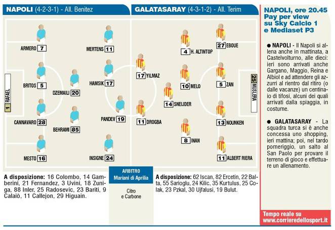 FOTO PROBABILI FORMAZIONI NAPOLI GALATASARAY DROGBA SNEIJDER – Non ci sarà la super festa che De Laurentiis aveva annunciato qualche settimana fa, a causa dell’incidente che ha scosso stamani l’Irpinia, ma saranno comunque presentate le nuove maglie e sarà giocata la gara tra Napoli e Galatasaray, questa sera al San Paolo di Napoli. Sarà tutto esaurito, come già vi avevamo annunciato nelle scorse ore, per quella che sarà la serata in cui, oltre alla presentazione dei nuovi acquisti, si disputerà un’amichevole internazionale di altissimo livello. Vi presentiamo le probabili formazioni della sfida di questa sera.