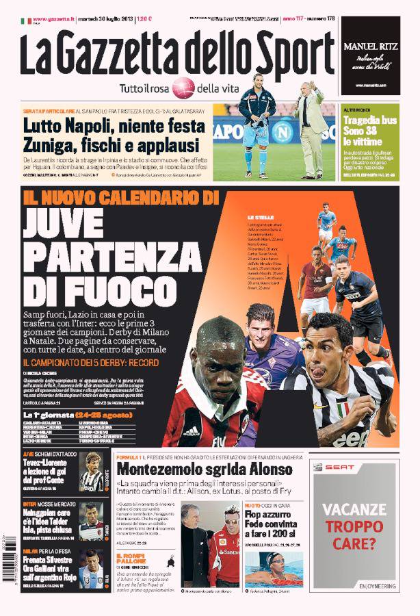 Gazzetta dello Sport: Juve partenza di fuoco 30/07/2013 di Admin3 GAZZETTA CALENDARI – Ieri sono stati redatti i calendari della nuova stagione. Partenza di fuoco per la Juventus. La redazione di Calciomercatonews.com