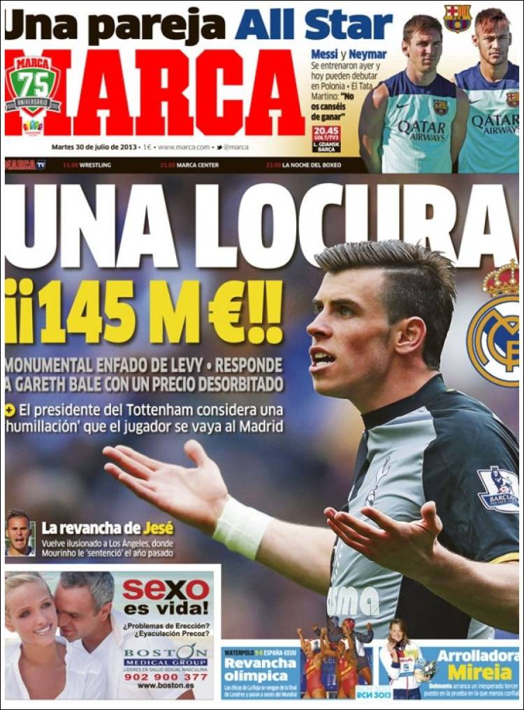 MARCA BALE – Il presidente del Tottenham Levy ha risposto che Bale costa 145 milioni di euro.