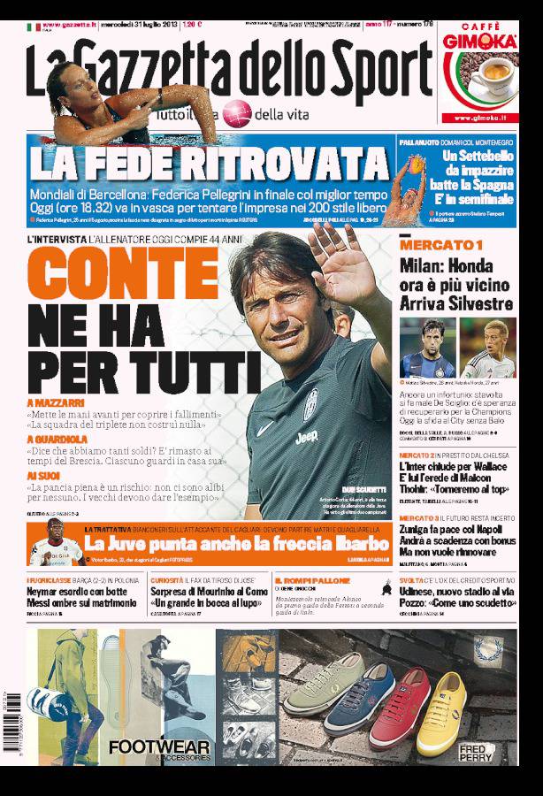 GAZZETTA CONTE – Sulla Gazzetta dello Sport intervista a Conte che critica Mazzarri, l’Inter del Triplete e anche Guardiola.