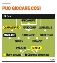 FOTO MAZZARRI 3-5-2 INTER – Rivoluzionare una squadra arrivata 9^ nell’ultimo campionato, non è assolutamente facile nemmeno per un allenatore talentuoso ed esperto come Walter Mazzarri, passato in estate dal Napoli all’Inter. Trovare la quadratura del cerchio dopo pochi allenamenti, è l’obiettivo del livornese che, nelle ultime ore, sta studiando quella che potrebbe essere la veste giusta per la sua Inter. Un 3-5-2 che possa abbinare offensivismo, rapidità ed intelligenza, quello che propone stamani la Gazzetta dello Sport: con l’arrivo di Wallace sulla destra, la squadra meneghina sarebbe assolutamente completa e pronta a lottare per una piazza di rilievo nel prossimo campionato.