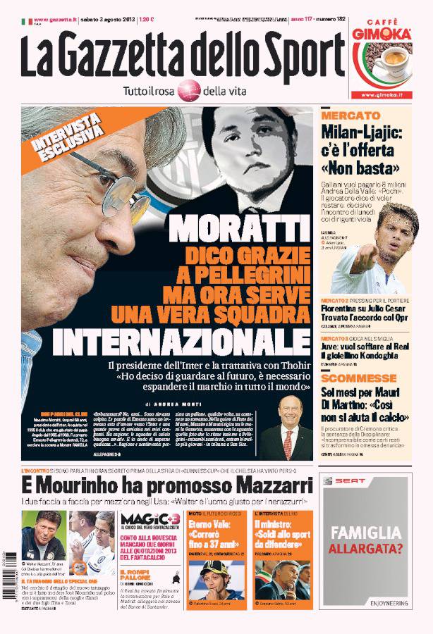 GAZZETTA MORATTI – Sulla Gazzetta dello Sport intervista esclusiva a Massimo Moratti, presidente dell’Inter, che ha deciso di vendere la società a Thohir.