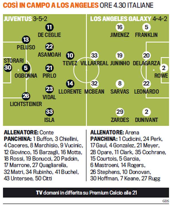 Juventus News Los Angeles Galaxy Amichevole Probabili Formazioni- Questa notte la Juventus giocherà a Los Angeles contro i Galaxy, l’ex squadra di Beckham. Antonio Conte schiererà la sua squadra con il consueto 3-5-2 con Storari in porta, Peluso, l’ex torinista Ogbonna e Lichtsteiner in difesa, a centrocampo sugli esterni ci saranno Isla a destra e De Ceglie sulla sinistra. Al centro agiranno Vidal, Pirlo e Asamoah. In attacco vengono invece confermati lo spagnolo Llorente e l’argentino Tevez. I due non hanno impressionato nell’amichevole persa contro gli inglesi dell’Everton, ma Conte vuole riuscire ad averli in buone condizioni per la finale di Supercoppa che si giocherà il 18 a Roma con la Lazio.
