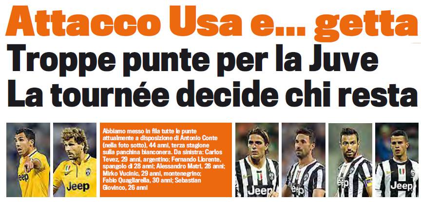 CALCIOMERCATO JUVENTUS – La Juventus si ritrova con sei attaccanti, tutti potenzialmente fatti per giocare da titolari, in squadra. Troppi per una squadra che ha deciso di puntare soprattutto sui nuovi arrivati, Carlitos Tevez e Fernando Llorente. Fermo restando che quest’ultimi due sono intoccabili, almeno uno tra Matri, Quagliarella, Giovinco e Vucinic dovrà lasciare la squadra bianconera. Mirko Vucinic si sta allenando bene e potrebbe partire se arrivasse un’offerta importante, dai 12 milioni in su. Più difficile ricevere buone offerte per Giovinco. Sul mercato restano Matri e Quagliarella che, però, non hanno ricevuto offerte gradite a loro e alla società. Lo Zenit sembrava interessato a Matri, ma il giocatore vorrebbe restare in Italia. Insomma, la situazione cessioni in casa Juventus è piuttosto ferma. Solo la tournèe in Usa dirà chi resterà e chi partirà. Anche se il rischio che non arrivino offerte importanti c’è.