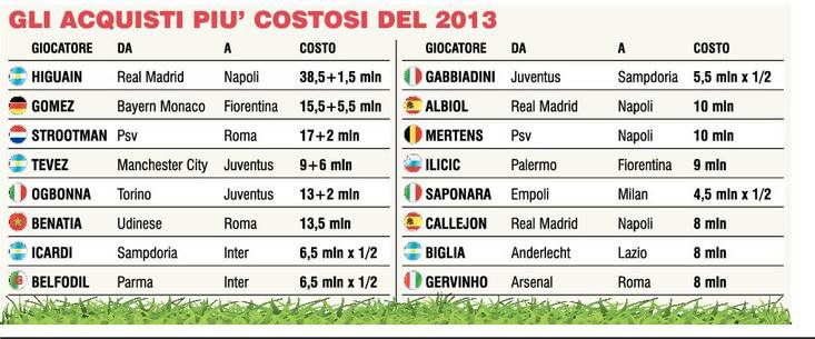 FOTO CALCIOMERCATO SERIE A ACQUISTI PIU’ CARI 2013 HIGUAIN – Davvero scoppiettante sin qui, la sessione estiva del calciomercato. A dispetto di quanto ci si potesse aspettare, sono infatti tanti i top player arrivati nel campionato italiano e sono davvero molti i milioni spesi dalle società dello stivale. Tutti riuniti in un’unica tabella, vediamo i calciatori più pagati di questa sessione di mercato. E’ ovviamente Higuain a trainare il carro, con i suoi quasi 40 milioni di euro, seguito da Mario Gomez e Kevin Strootman. Nonostante i primi botti sono già stati compiuti, manca ancora un mese esatto alla conclusione del mercato. Chissà che questa tabella non possa essere ancora aggiornata…
