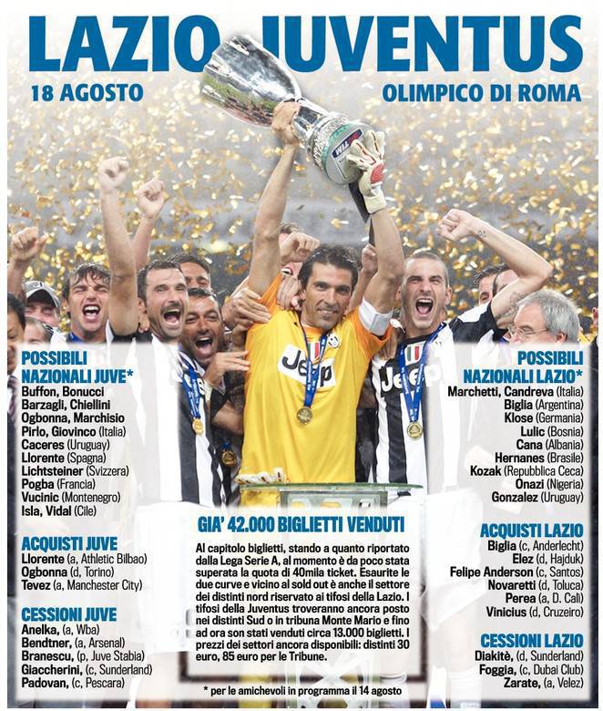 FOTO SUPERCOPPA ITALIANA LAZIO JUVENTUS – Segnata in rosso sul calendario per tifosi della Juventus e della Lazio, si avvicina sempre di più la fatidica data del 18 agosto, giorno della Supercoppa italiana tra Lazio e Juventus, gara che assegnerà il primo trofeo della stagione del calcio nostrano. Dopo due preparazioni essenzialmente diversi, e due mercati condotti in maniera differente dalle due società, arriveranno allo Stadio Olimpico di Roma, due squadre pronte a disputare il prossimo campionato di Serie A. Chi avrà la meglio tra le due squadre? La Juventus, pronta a confermarsi, dopo il trionfo della scorsa stagione, o la Lazio, chiamata a rialzare la coppa dopo 4 anni di digiuno?