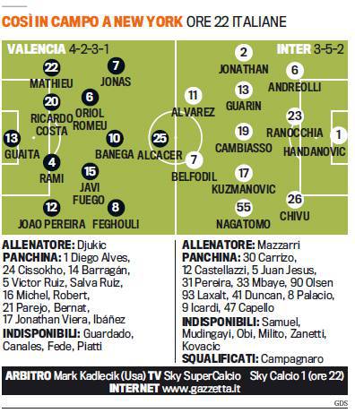 INTER VALENCIA FORMAZIONI – L’Inter di Walter Mazzarri torna in campo contro il Valencia per la seconda partita della Guinness Cup. L’appuntamento è per oggi alle 22 con diretta su Sky e, all’una di notte, in differita su Inter Channel. Si gioca al MeT Life Stadium di East Rutherford, a un paio di chilometri da New York. Il Valencia scenderà in campo con il 4-2-3-1 con Guaita tra i pali; Mathieu, Ricardo Costa, Rami e Joao Pereira in difesa; a centrocampo Oriol Romeu e Javi Fuego; sulla trequarti Jonas, Banega e Feghouli con l’unica punta Alcacer. Mazzarri, invece, schiererà l’Inter con il 3-5-2 con Handanovic tra i pali; Andreaolli, Ranocchia e Chivu in difesa; Jonathan, Guarin, Cambiasso, Kuzmanovic e Nagatomo a centrocampo; Alvarez e Belfodil in attacco.