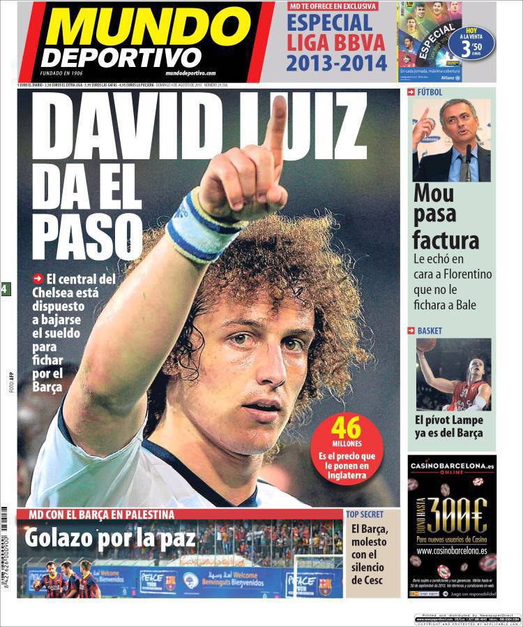 RASSEGNA STAMPA MUNDO DEPORTIVO – Il Barcellona è vicino a David Luis. Il centrale brasiliano del Chelsea è l’obiettivo numero uno per la difesa blaugrana dopo l’acquisto di Marquinhos da parte della Roma e l’impossibilità di arrivare a Thiago Silva.