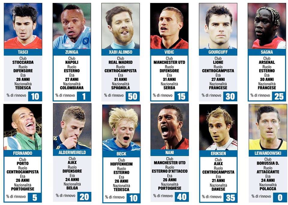 FOTO TOP 12 CONTRATTO SCADENZA 2014 – In un mercato dove la crisi regna sovrana, riuscire a chiudere le migliori operazioni, senza dover compiere uno sforzo economico esagerato, è un obiettivo, se non il primo, di tutte le più grandi società italiane ed europee. La prossima sessione di mercato, quella dell’inverno 2014, potrebbe essere particolarmente dedicata agli affari a zero, vista l’abbondanza di campioni con il contratto in scadenza a giugno del 2014. Da Eriksen a Xabi Alonso, passando per Zuniga, Vidic, Nani e Lewandowski, c’è davvero l’imbarazzo della scelta. Eccoli i migliori 12 calciatori con contratto in scadenza, accompagnati dalle percentuali di rinnovo con gli attuali club. Chi farà il colpo migliore?