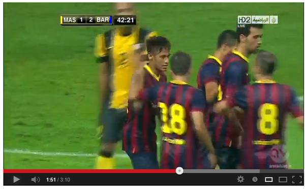 VIDEO BARCELLONA MALESIA 3 1 – Si è conclusa con il risultato di 3 a 1 per il Barcellona l’amichevole contro la Malesia. Il club blaugrana ha ottenuto la vittoria grazie alle reti di Fabregas, Pique e di Neymar, al secondo gol consecutivo in partite con la casacca azulgrana. Di seguito il video con le 4 reti.