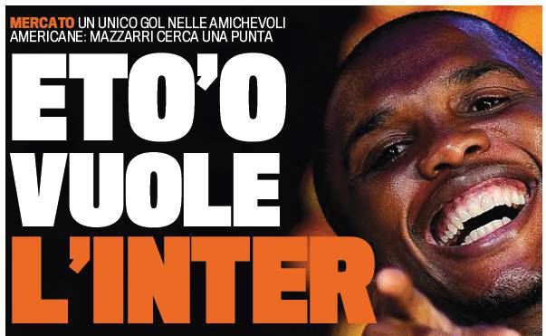 CALCIOMERCATO INTER ETO’O INGAGGIO – Samuel Eto’o ha deciso di ritornare all’Inter e giocare con la maglia nerazzurra. Il campione camerunense dell’Anzhi ha parlato con il patron Kerimov che è disposto a lasciarlo andare per una cifra simbolica o addirittura a costo zero. E’ la notizia che aspettava l’Inter. Ora bisognerà trovare un accordo per l’acquisto del 32enne camerunense che però chiede un triennale all’Inter. Il nodo principale da sciogliere è l’ingaggio, Eto’o non potrà mai prendere 10 milioni di euro in nerazzurro, serve un taglio netto e deciso che possa aiutare l’Inter a sostenere l’acquisto del giocatore di colore.