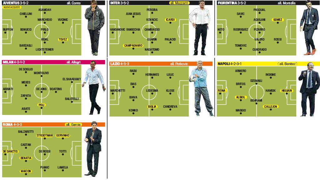 SERIE A MILAN INTER JUVENTUS NAPOLI ROMA FIORENTINA E LAZIO – Il campionato sta per cominciare anche se il calciomercato non è ancora chiuso: questo significa che ci sarà tempo fino al 2 settembre per le varie squadre di cercare di rafforzarsi al meglio con colpi mirati. Intanto, per quello visto fino ad oggi, ecco come giocherebbero le principali big della Serie A. Il club con volti più nuovi è la Roma che si rinforza non solo nel reparto arretrato (De Sanctis, Benatia e Maicon) ma anche a centrocampo (Strootman) e in attacco (Gervinho). Nella Fiorentina da sottolineare la nuova scoppiettante coppia d’attacco targata Gomez-Rossi. Nella Juventus non cambia molto rispetto al passato eccezion fattaper Tevez così come nel Milan (Poli). Il Napoli invece si è rafforzato molto con l’arrivo di Higuain e di altri elementi di spicco.