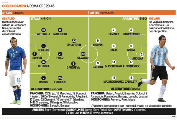 ITALIA ARGENTINA FORMAZIONI OSVALDO PALACIO HIGUAIN – Tutti in campo per Papa Francesco. Amichevole di lusso della Nazionale italiana di Prandelli che questa sera giocherà contro l’Argentina. Il c.t. Prandelli manderà in campo una formazione sperimentale possiamo dire viste anche le assenze. Basti pensare a De Rossi centrale di difesa assieme a Chiellini, con Antonelli e Maggio esterni, centrocampo con Florenzi, Pirlo e Marchisio, mentre Candreva e Giaccherini sosterranno la punta Osvaldo. Nell’Argentina tanta Italia, Fernandez del Napoli in difesa, Biglia della Lazio a centrocampo, attacco con Higuain e Palacio. Ecco le probabili formazioni della Gazzetta dello Sport.