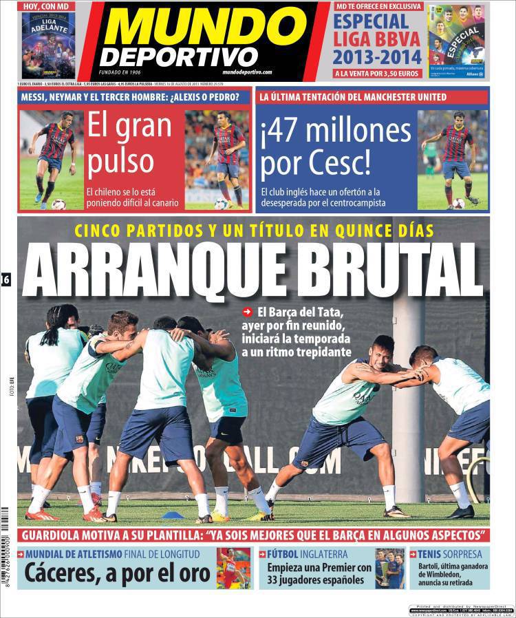 RASSEGNA STAMPA MUNDO DEPORTIVO – Inizio brutale per il Barcellona di Tata Martino chiamato a disputare cinque partite e a giocarsi il primo titolo della stagione in quindici giorni. Una prova del nove per la squadra catalana che dovrà dimostrare di non aver subito il colpo del cambio della guida.