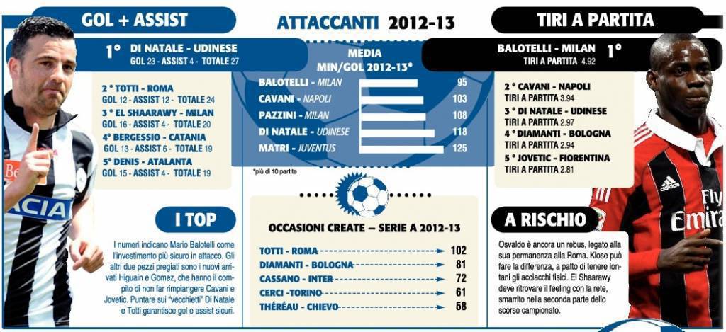 FOTO FANTACALCIO CONSIGLI OPTA TUTTOSPORT – Sarà una settimana decisiva, la prossima, per i fantallenatori: è finalmente arrivato il momento di strutturare la propria squadra grazie alle aste, momento più atteso e temuto della stagione. Tuttosport, in collaborazione con la nota azienda di dati e statistiche, Opta, ha realizzato un interessante specchietto che mette in fila gli attaccanti dal migliore rendimento della scorsa stagione. Categorie riportate: classifica gol + assist, tiri per partita e media minuti-gol. Da ciò si tirano le somme per quelli che potrebbero essere gli attaccanti top ed i flop della prossima stagione. E voi, su chi punterete per il vostro fantacalcio?