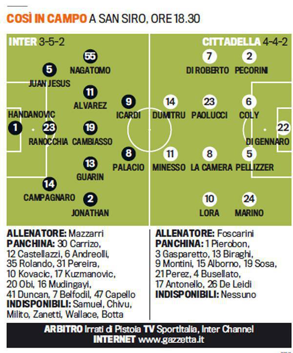 COPPA ITALIA INTER CITTADELLA PROBABILI FORMAZIONI – Questa sera, alle 18.30, l’Inter di Walter Mazzarri debutta a San Siro in una gara valida per il terzo turno di Coppa Italia. Di fronte ci sarà il Cittadella. Per la prima partita ufficiale della stagione, il tecnico toscano schiererà l’Inter con il 3-5-2 con Handanovic tra i pali; Campagnaro, Ranocchia, Juan Jesus in difesa; Jonathan e Nagatomo sulle fasce; a centrocampo ci saranno Guarin, Cambiasso e Alvarez; in attacco spazio a Palacio e Icardi. Il Cittadella risponde con il 4-4-2 con Di Gennaro in porta; Pecorini, Coly, Pellizzer, Marino in difesa; a centrocampo Di Roberto, Paolucci, La Camera, Lora. In attacco Dumitru e Minesso.
