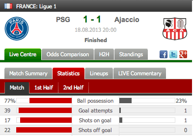 FOTO INCREDIBILI STATISTICHE PSG AJACCO 39 OCCASIONI – Il calcio è materia di difficilissima comprensione. Puoi attaccare per un’intera partita, tentare le azioni più semplici e quelle più difficili, ma quando la porta è stregata, c’è davvero poco da fare. Lo sa benissimo il Paris Saint Germain che dopo aver asfaltato sul piano del gioco l’Ajaccio, ha portato a casa un misero punticino. Le statistiche parlano chiaro: 77% di possesso palla, 39 occasioni ad 1 per i parigini con ben 17 tiri verso la porta. Ci è voluta una magia di Cavani per trovare il punto dell’1-1… E che beffa sarebbe stata, senza il pareggio del Matador, per la squadra allenata da Blanc…