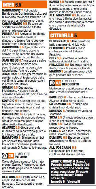 INTER CITTADELLA VOTI PAGELLE GAZZETTA SPORT – Poco più in basso troverete i voti e le pagelle Gazzetta dello Sport di Inter-Cittadella, partita valevole per la Coppa Italia, giocatasi ieri alle ore 18.30 e conclusasi con la vittoria schiacciante dei nerazzurri per 4 a 0. Migliore dell’incontro è Rodrigo Palacio, autore di una doppietta. Molto bene anche Samir Handanovic che ha chiuso la porta in un paio di occasioni agli avversari. Fra i migliori dell’incontro anche il neo-acquisto Campagnaro nonché Guarin e Andrea Ranocchia.