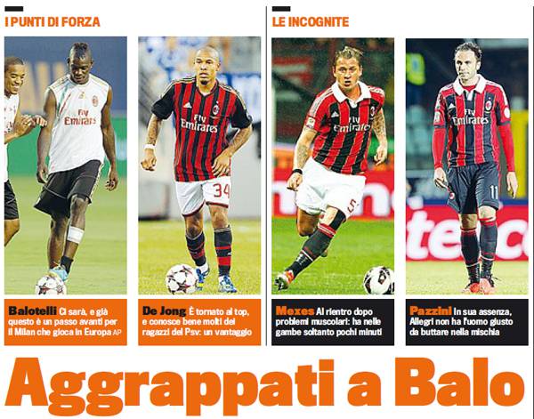PSV MILAN BALOTELLI DE JONG INCOGNITE – Domani il Milan si gioca tantissimo nell’andata del preliminare di Champions League. I rossoneri sperano ovviamente di puntare su Mario Balotelli, vero e proprio fuoriclasse, giocatore importante per il Milan. Balotelli sta bene e vuole spingere il Milan verso il superamento del turno dei preliminari di Champions League. Allegri si affiderà anche a De Jong, una vera certezza in mezzo al campo mentre ci sono alcune incognite legate in difesa, con Mexes senza molti minuti nelle gambe. Ma anche la mancanza di Pazzini potrebbe pesare tanto per il Milan.