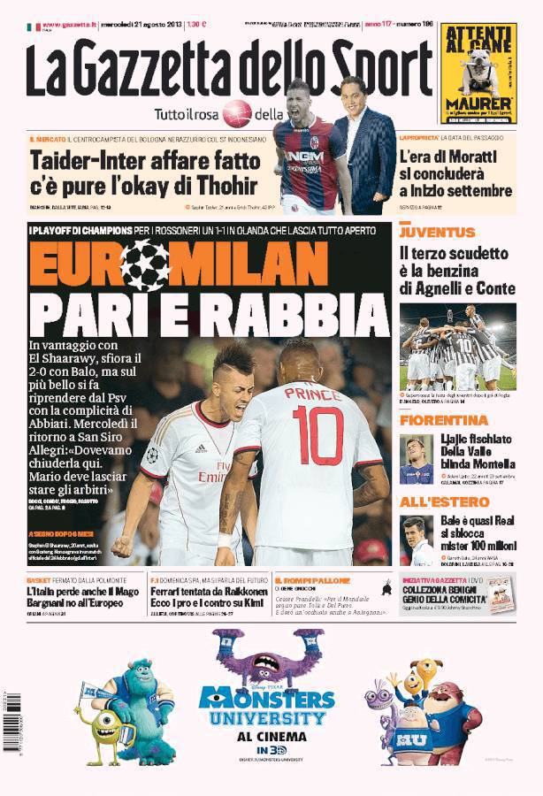 GAZZETTA MILAN – Sulla Gazzetta dello Sport si parla del Milan che pareggia contro il Psv per uno a uno nell’andata del preliminare.