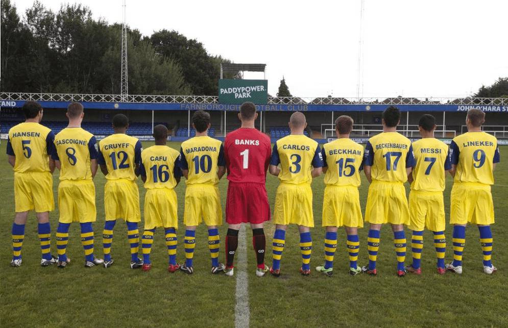 FARNBOROUGH MESSI PELE MARADONA ZIDANE / Il Bookmarker irlandese Paddy Power è pronto a tirare fuori una nuova formidabile strategia di marketing nel nuovo accordo di sponsorizzazione con il Farnborough F.C., club impegnato nella divisione sud Conference. Ma in cosa consiste l’opera magna di restyling? I giocatori hanno accettato di cambiare il loro nome sostituendolo con vere e proprie leggende del calcio, da George Best a Zidane passando per Maradona e così via. Il centrocampo dunque è formato da George Best (Reece Jones), Paul Gascoigne (Stephen Laidler, Zinedine Zidane (Merrick James-Lewis) e Johann Cruyff (Tyrone Berry). Sul fronte d’attacco, il tecnico Josè Mourinho (Spencer Day) può scegliere tra Lionel Messi (Daniel Bennett), Gary Lineker (Reece Connolly), Diego Maradona (David Tarpey) e Pele (Elvis Hammond). Una squadretta niente male, peccato si tratti solo di nomi stampati sulle casacche.