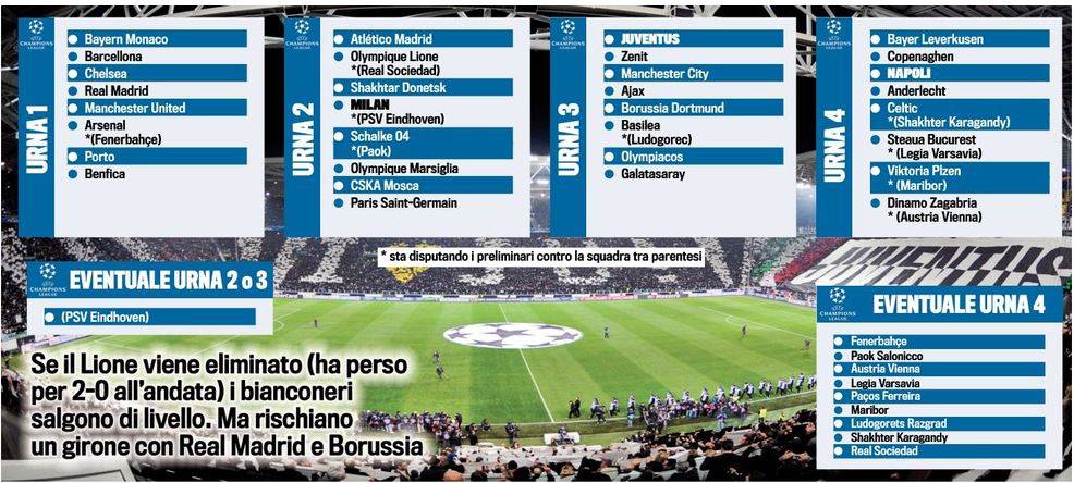 Milan News Juventus Champions League- Si inizia a pensare alla Champions League e ai gironi che verranno sorteggiati nei prossimi giorni. Quest’anno però la fascia di appartenenza potrebbe non aiutare più di tanto: la Juve, in terza fascia, potrebbe infatti avere un girone più facile del Milan (seconda fascia). In terza spaventano infatti il Borussia Dortmund e il Manchester City, oltre al Galatasaray di Drogba e Sneijder.Oltre al Real Madrid, Barcellona o Bayern Monaco, i rossoneri potrebbero quindi finire nel girone con Dortmund e Real Sociedad o Fenerbahce (quarta fascia).Se il Lione dovesse uscire (ha perso 2-0 l’andata) verrebbe promossa in seconda fascia la Juve, ma non è detto che sia un vantaggio…