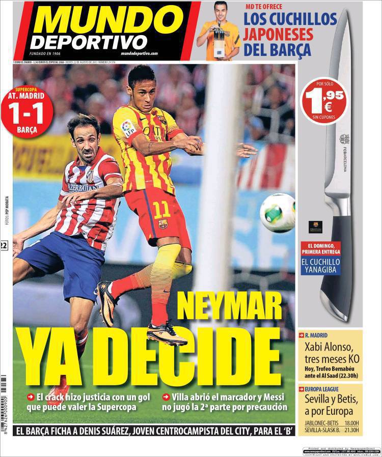 MUNDO DEPORTIVO NEYMAR – Un colpo di testa di Neymar porta il Barcellona al pareggio contro l’Atletico Madrid nell’andata della Supercoppa di Spagna.