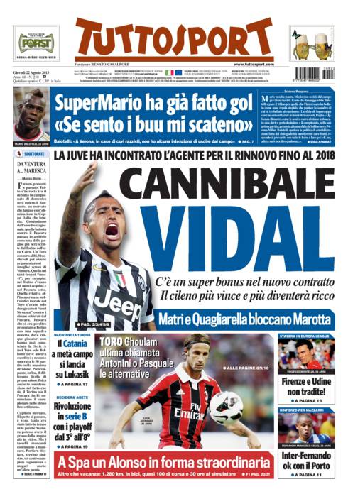 TUTTOSPORT VIDAL – Su Tuttosport si parla di Vidal che è pronto a rinnovare il proprio contratto fino al 2018.