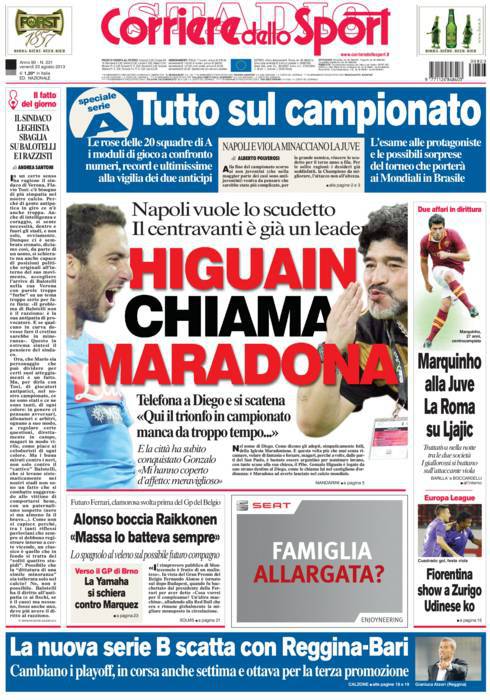 CORRIERE HIGUAIN – Sul Corriere dello Sport si parla di Higuain che chiama Maradona per aumentare l’entusiasmo di Napoli.