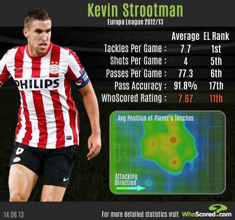 SERIE A STROOTMAN ROMA – Interessava moltissimo al Milan ma alla fine la Roma ha spiazzato tutti andando ad acquistare dal Psv per 16,5 milioni di euro il giovane ma esperto Kevin Strootman, centrocampista sia di qualità che di interdizione. Garcia ha disegnato una squadra in cui il ragazzo sarebbe uno dei punti fermi su cui instaurare un ciclo anche se, dopo l’infortunio rimediato nel precampionato, il nuovo tecnico giallorosso dovrà fare a meno di lui per almeno un mese. Intanto, come si vede dalla foto tratta da Whoscored.com, ecco qualche dato riguardo Strootman: atleta che si muove per tutto il campo con abilità multiple. Bene sia nei tackle, nei tiri ma anche nei passaggi. Sarà lui il nuovo cervello della Roma?