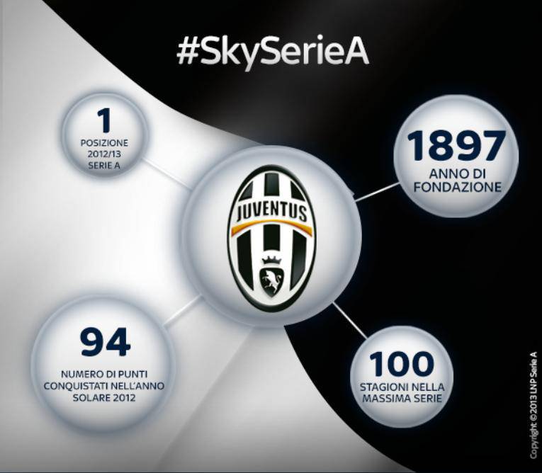 FOTO JUVENTUS SERIE A – La Juventus ha ancora fame di vittorie: questo sostanzialmente ha fatto capire Antonio Conte. Dopo la roboante vittoria in Supercoppa contro la Lazio, i bianconeri scenderanno in campo questa sera contro la Sampdoria, squadra che è riuscita nell’impresa di battere gli attuali campioni d’Italia 2 volte su 2 l’anno scorso. Come si vede dall’immagine Sky, la Juventus inizia la nuova avventura in campionato forte di due scudetti consecutivi conquistati e di 94 punti ottenuti in tutto il 2012. Dati che fanno paura. Con la vittoria del terzo titolo potrebbe aprirsi davvero un ciclo vincente e magari il prossimo step sarà quello di fare qualcosa anche fuori dall’Italia. Se lo augurano i tifosi della Juventus.