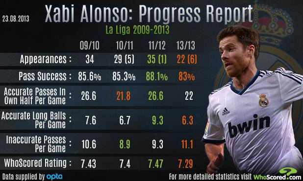 FOTO XABI ALONSO REAL MADRID – Xabi Alonso attualmente infortunato e dovrà stare fuori per qualche mese. Al suo rientro però troverà un centrocampo più affollato che mai. Dopo l’arrivo di Bale, Ancelotti deve ridisegnare una squadra che includa il gallese assieme a Cristiano Ronaldo, Isco e tutti gli altri Galacticos. Con il possibile 4-2-3-1, davanti la difesa agirebbero due fra Modric, Casemiro o Illaramendi. E Xabi Alonso? Probabilmente finita la sua carriera al Real Madrid. Non è da escludere infatti una possibile partenza dello spagnolo. I numeri sono ancora da top player come si legge dalla foto tratta da WhoScored.com (impressionante il successo dei passaggi: 83%) e a molti club italiani farebbe comodo un giocatore simile…