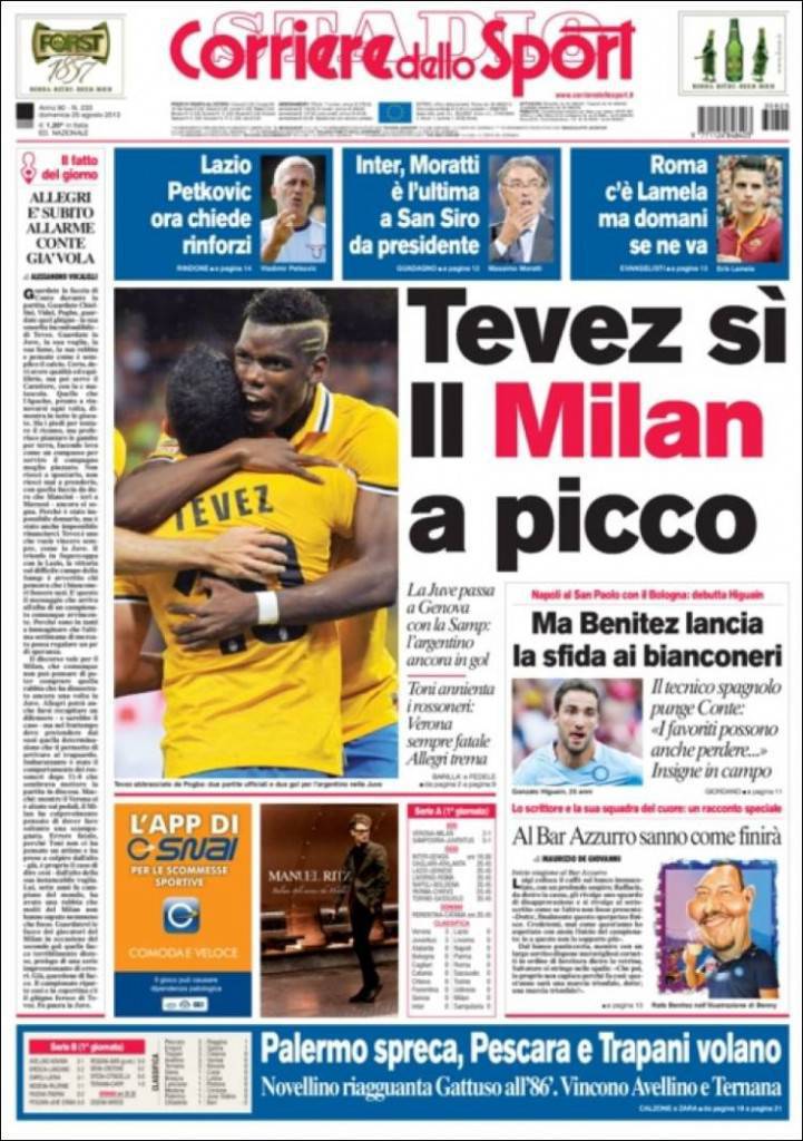 RASSEGNA STAMPA CORRIERE DELLO SPORT – Il Corriere dello Sport di oggi dedica ampio spazio alle due partite di ieri. Bene la Juventus che supera di misura la Samp grazie al primo gol di Tevez in maglia bianconera, male il Milan che a Verona, dopo essersi portato in vantaggio con Poli, viene superato da una doppietta di Toni.