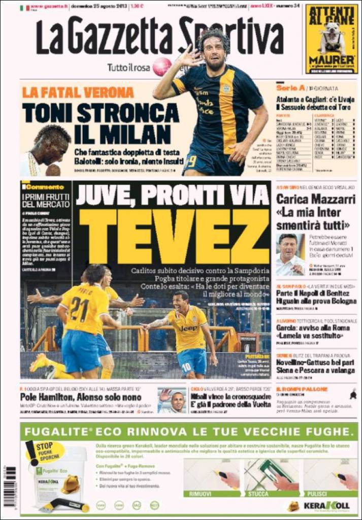 GAZZETTA DELLO SPORT PRIMA PAGINA – La prima pagina del La Gazzetta dello Sport di oggi è dedicata alla vittoria della Juventus sulla Sampdoria, grazie alla prima rete di Tevez con la maglia bianconera, e alla debacle del Milan in quel di Verona: a decidere una doppietta di Toni.
