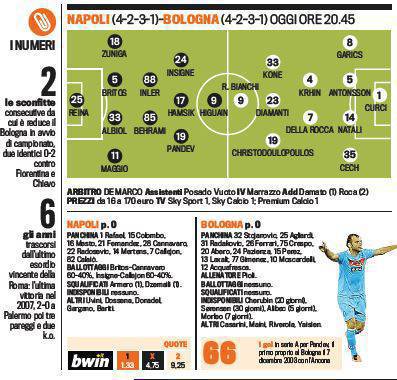 SERIE A NAPOLI BOLOGNA HIGUAIN – Il Napoli questa sera si troverà di fronte il Bologna nella prima giornata del nuovo campionato. Rafa Benitez vuol iniziare la sua avventura sulla panchina partenopea nel migliore dei modi. Come si vede dalla foto, questo dovrebbe essere l’undici del Napoli che scenderà in campo. In porta il nuovo arrivato Reina. Davanti a lui difesa a quattro con Maggio e Zuniga larghi e Albiol e Britos centrali. A centrocampo Behrami e Inler faranno da filtro. Dietro l’unica punta Higuain, in campo dal 1′, troviamo Pandev, Hamsik e Insigne, quest’ultimo preferito allo spagnolo Callejon.